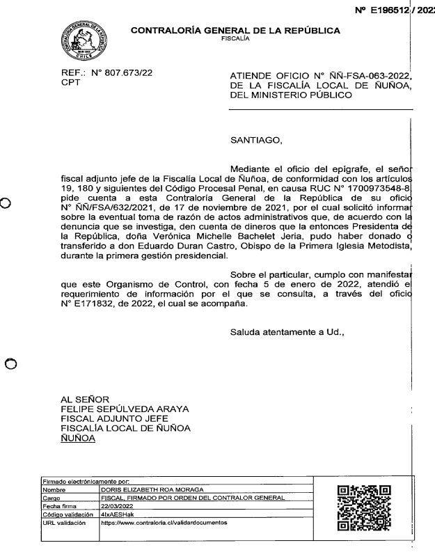 La solicitud se apoya en oficios emitidos los días 5 de enero y 22 de marzo de 2022, firmados por Henry Hantsch Salinas y Doris Roa Moraga, respectivamente, que —según la defensa— descartarían la existencia de irregularidades administrativas vinculadas a los fondos denunciados.